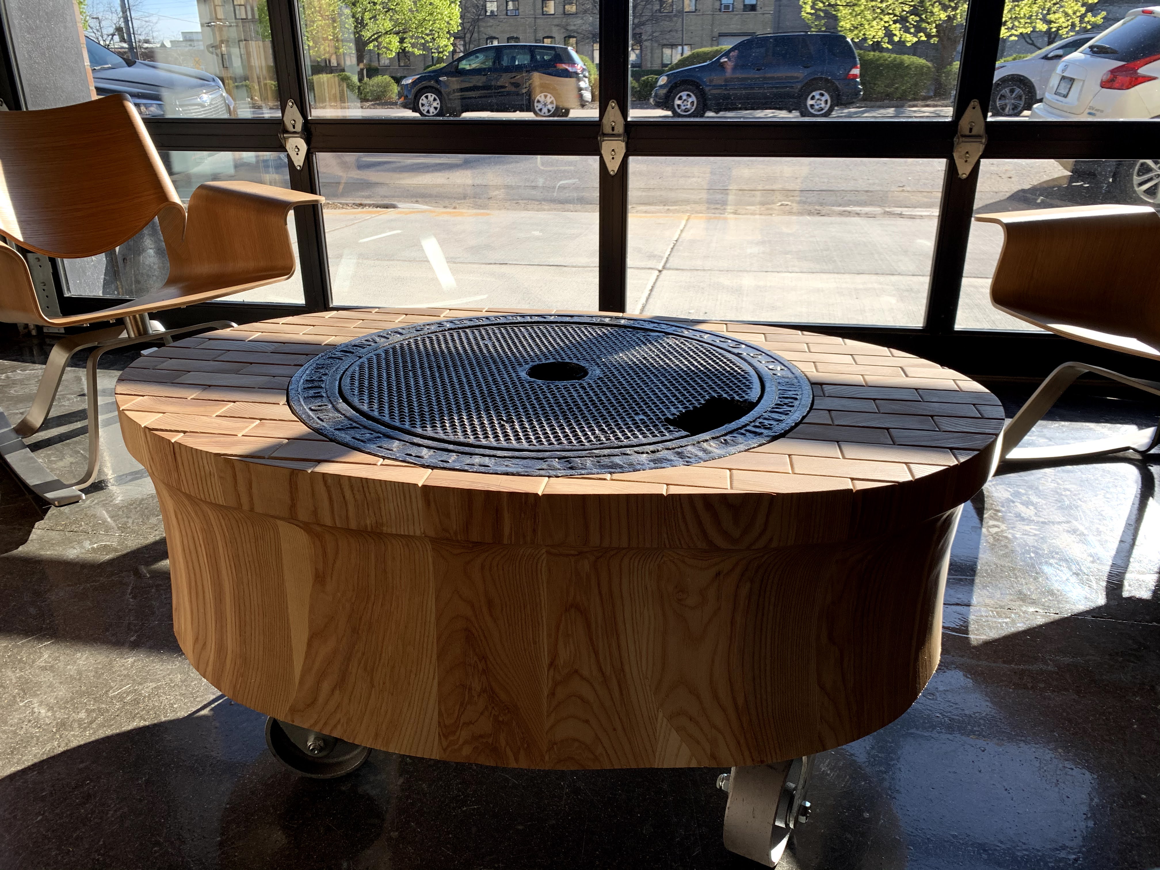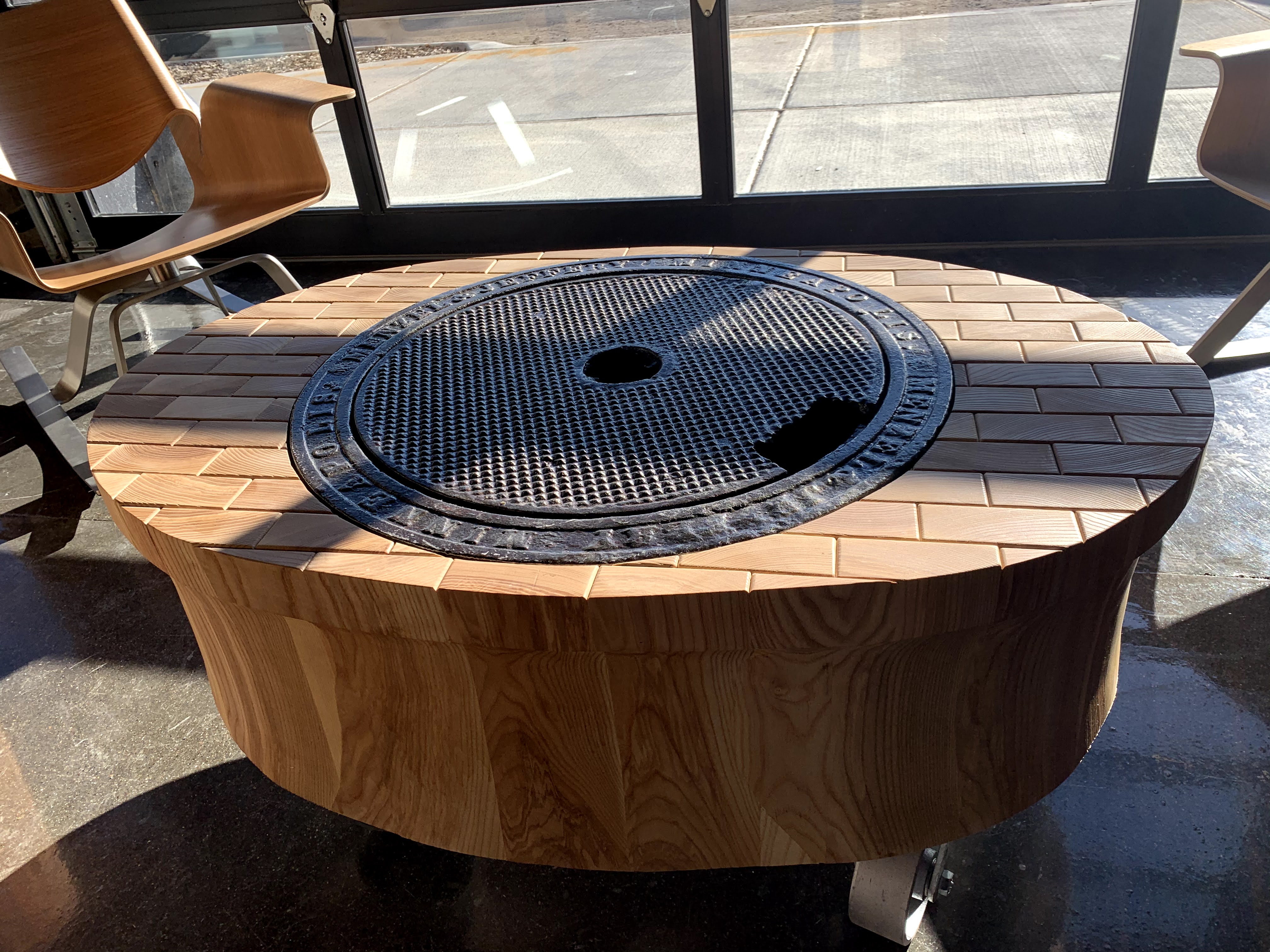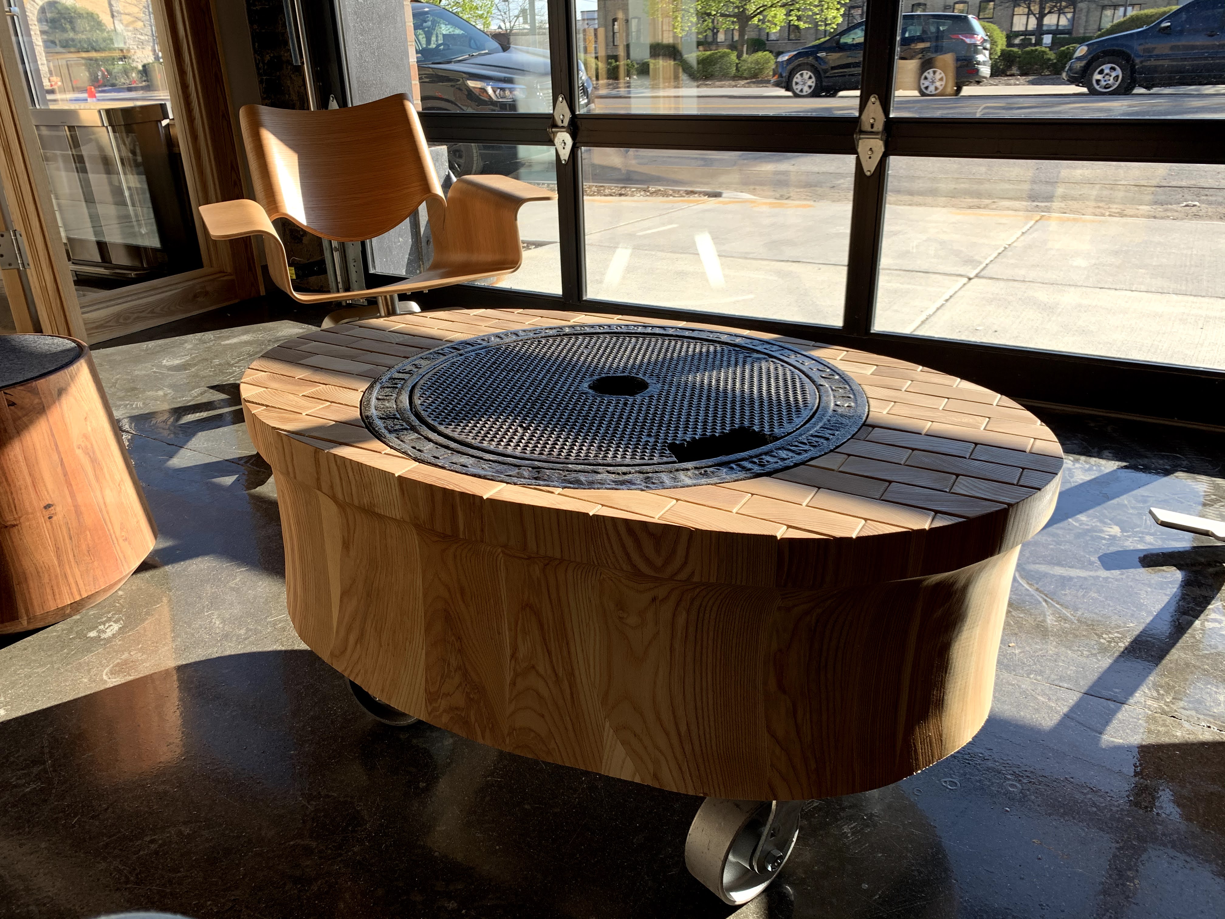 Manhole Coffee Table – White ash, upcycled drain cover, steel casters